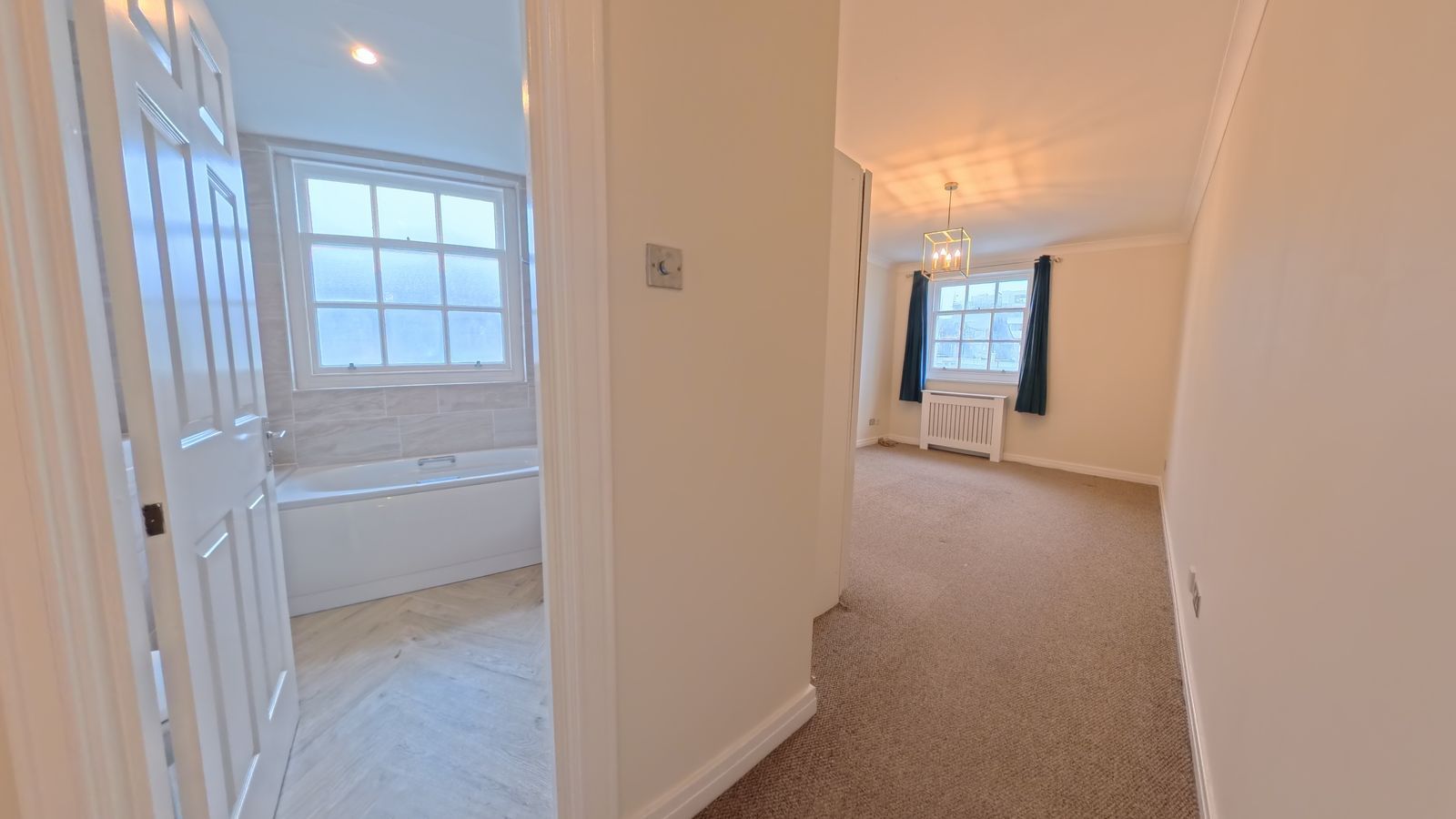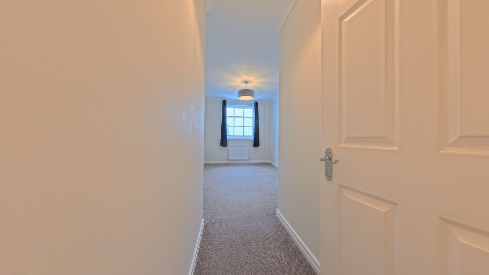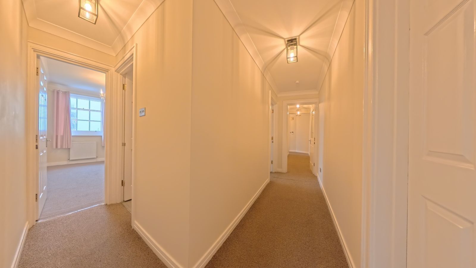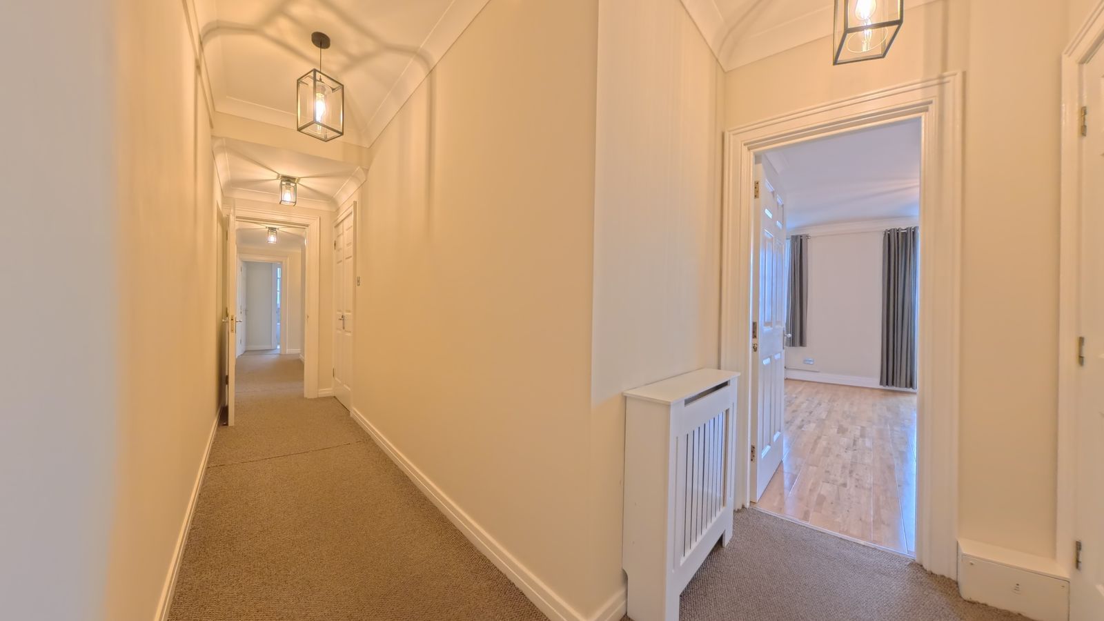 A long hallway leading to two generous double bedrooms and the main bathroom.