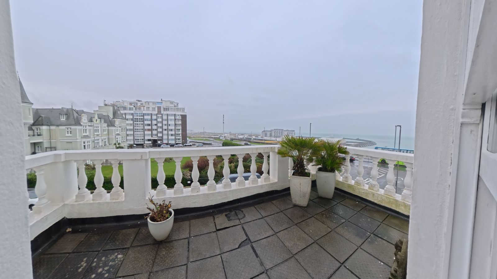 A large private balcony with uninterrupted sea views — ideal for relaxing on warm summer days.